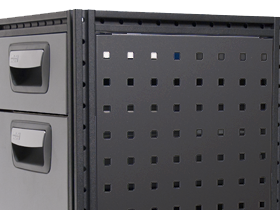 Hmotnost našich modulů lze optimalizovat pomocí volitelných krycích panelů a nástrojových desek. Při použití například s zásuvkovými díly a rámy oblouku kola jsou krycí panely a nástrojové desky namontovány pomocí klipů. Vzor otvorů v nástrojových deskách umožňuje připevnění příslušenství, jako jsou síťované koše a držáky formulářů. V kombinaci s držáky nástrojů poskytují všestranné a pohodlné uložení nástrojů.