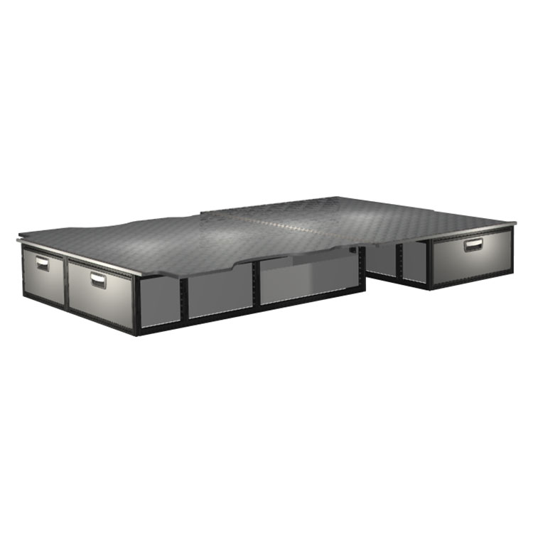 The kit is designed to be fitted on top of a Modul-Floor, utilizing the floor rails for a non-intrusive installation. The double floor is equipped with rails for easy installation of vehicle racking, and edging strips for a nice finish.