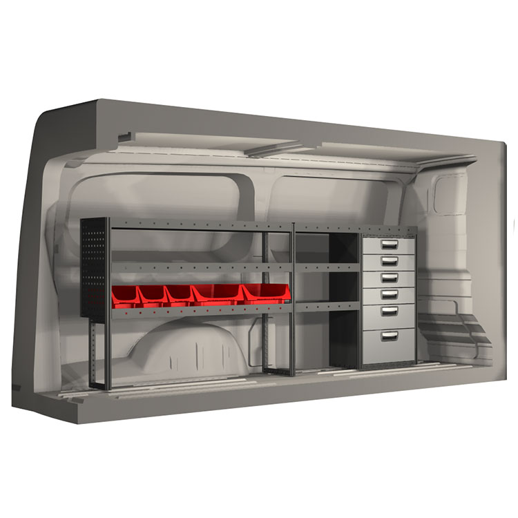 The racking has been specially designed to ensure the optimum fit to the vehicle, as well as the best possible functionality and safety. It has been developed for professional use, is flexible and is intended for service jobs in various types of business. All shelves are equipped with rubber mats, and all drawers with foam plastic liners. Assembly material is included.