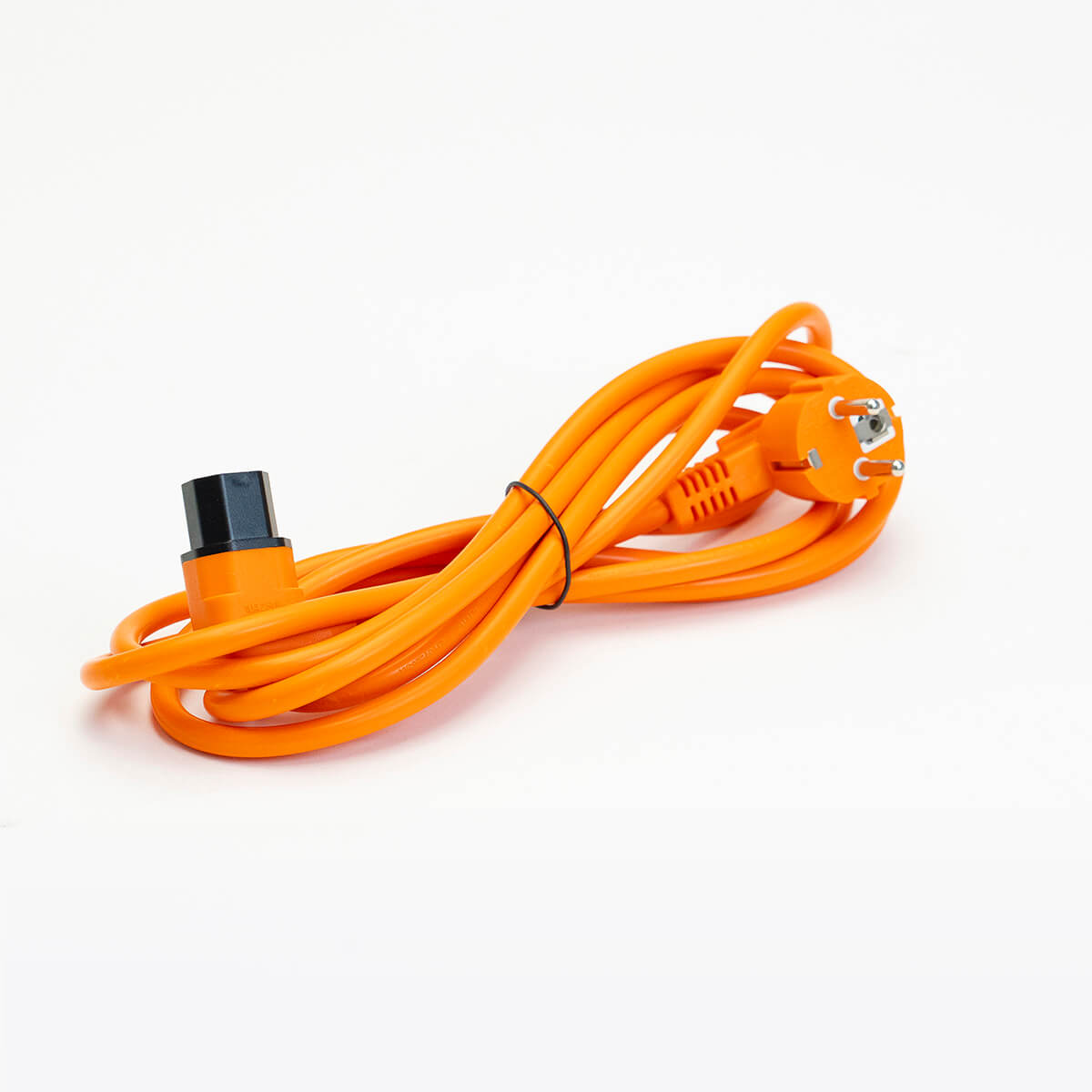 This 3-meter IEC power cable is used to charge the e-Power system from the grid. It features a standard EU plug and IEC C13 connector for a secure and reliable AC connection. The bright orange insulation complies with high-voltage standards, ensuring visibility and safety.