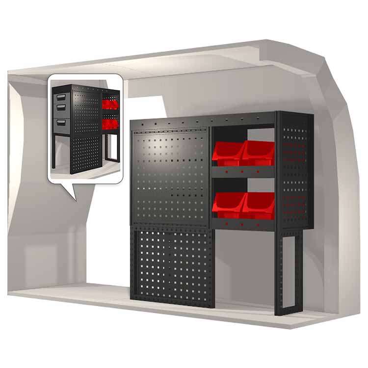 The racking has been specially designed to ensure the optimum fit to the vehicle, as well as the best possible functionality and safety. It has been developed for professional use, is flexible and is intended for service jobs in various types of business. All shelves are equipped with rubber mats, and all drawers with foam plastic liners. Assembly material is included.