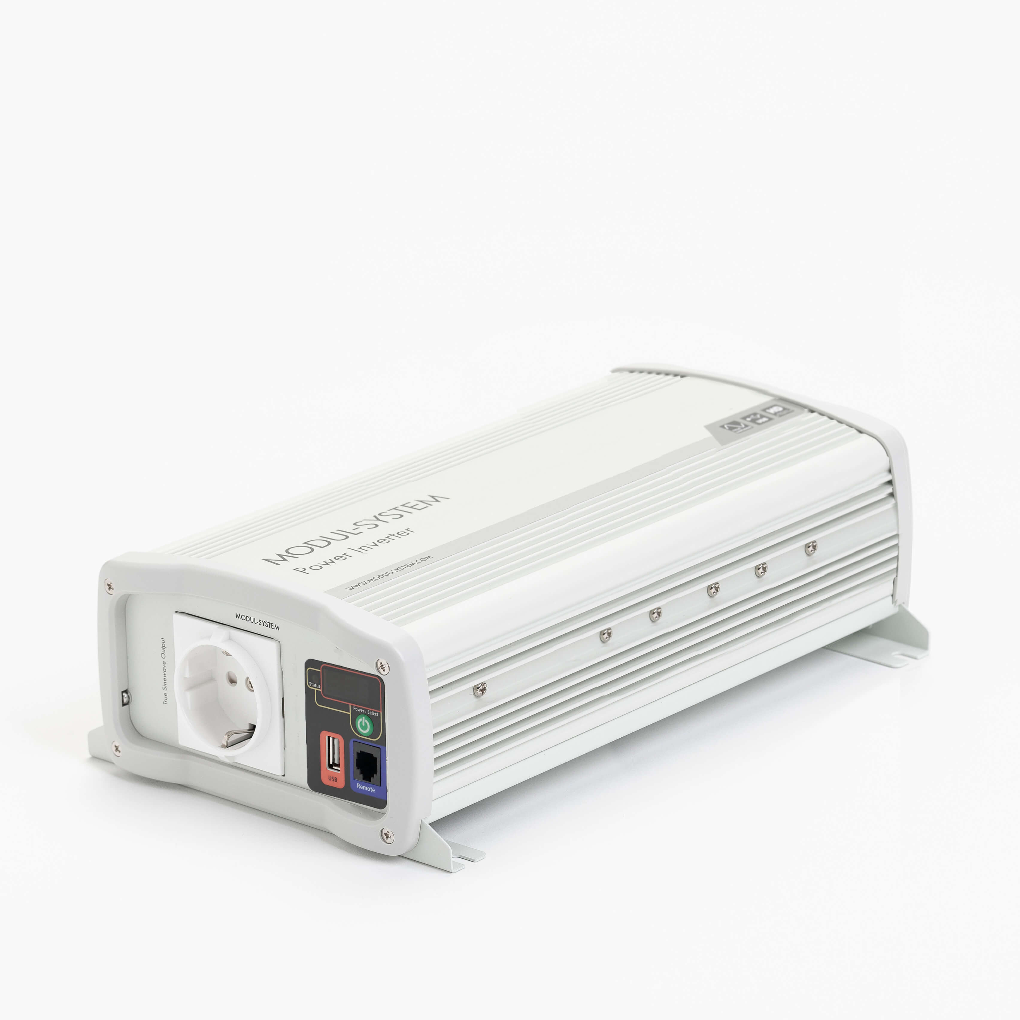 The inverter has a display panel for battery status and load measurement, an EU output socket and a USB port for charging USB devices. Integrated fixing points and high quality DC connectors make the installation simple.