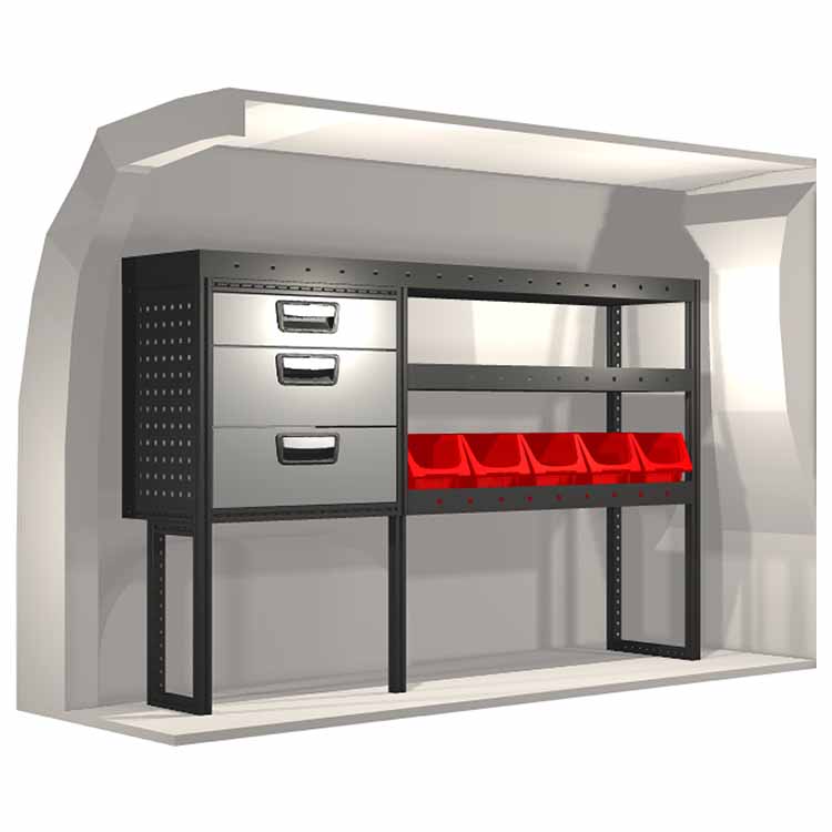 The racking has been specially designed to ensure the optimum fit to the vehicle, as well as the best possible functionality and safety. It has been developed for professional use, is flexible and is intended for service jobs in various types of business. All shelves are equipped with rubber mats, and all drawers with foam plastic liners. Assembly material is included.