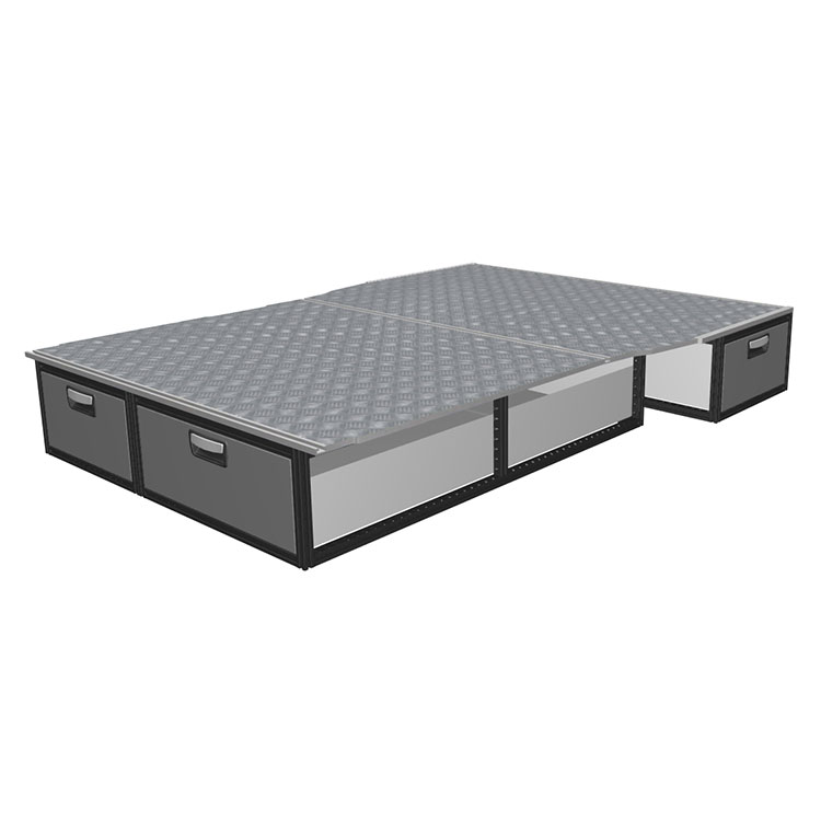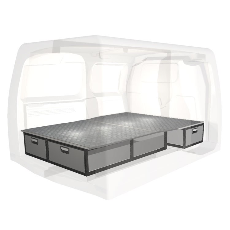 The kit is designed to be fitted on top of a wooden floor. The double floor is equipped with rails for easy installation of vehicle racking, and edging strips for a nice finish.