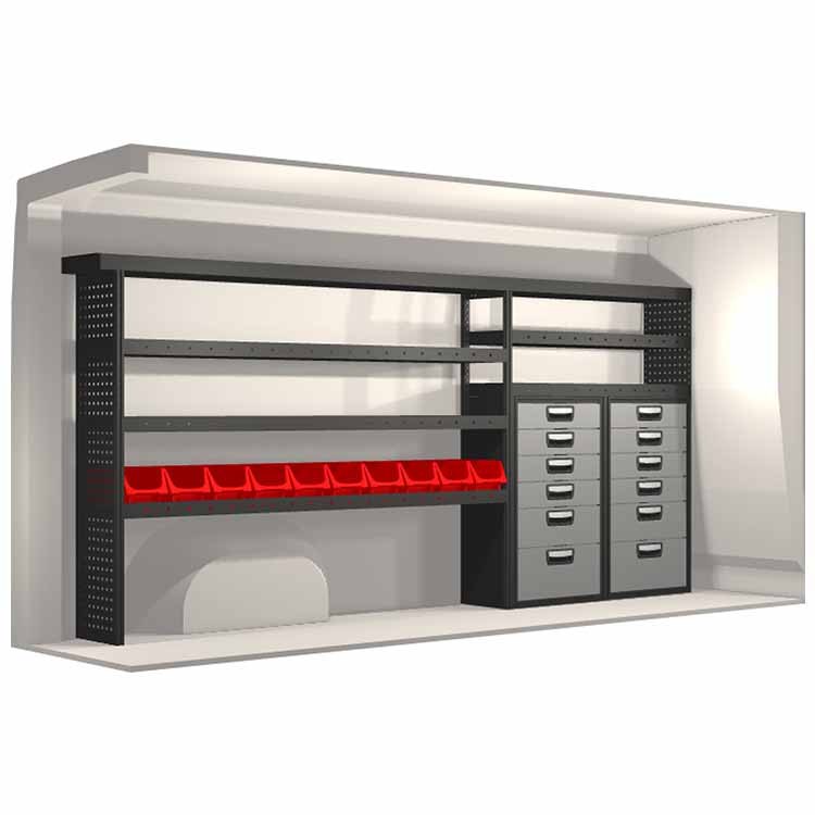 The racking has been specially designed to ensure the optimum fit to the vehicle, as well as the best possible functionality and safety. It has been developed for professional use, is flexible and is intended for service jobs in various types of business. All shelves are equipped with rubber mats, and all drawers with foam plastic liners. Assembly material is included.