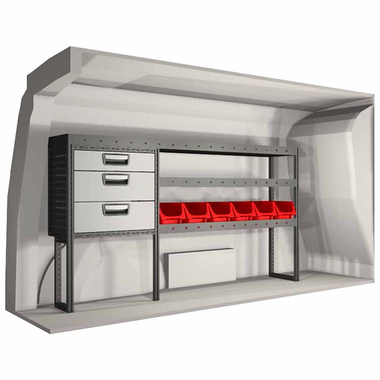 The racking has been specially designed to ensure the optimum fit to the vehicle, as well as the best possible functionality and safety. It has been developed for professional use, is flexible and is intended for service jobs in various types of business. All shelves are equipped with rubber mats, and all drawers with foam plastic liners. Assembly material is included.