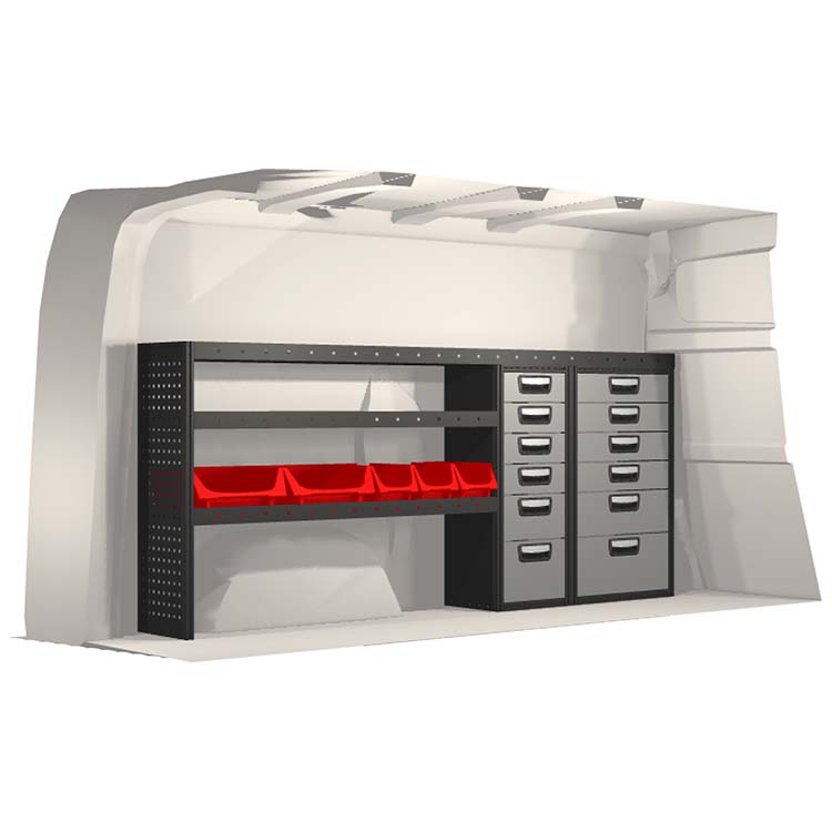 The racking has been specially designed to ensure the optimum fit to the vehicle, as well as the best possible functionality and safety. It has been developed for professional use, is flexible and is intended for service jobs in various types of business. All shelves are equipped with rubber mats, and all drawers with foam plastic liners. Assembly material is included.