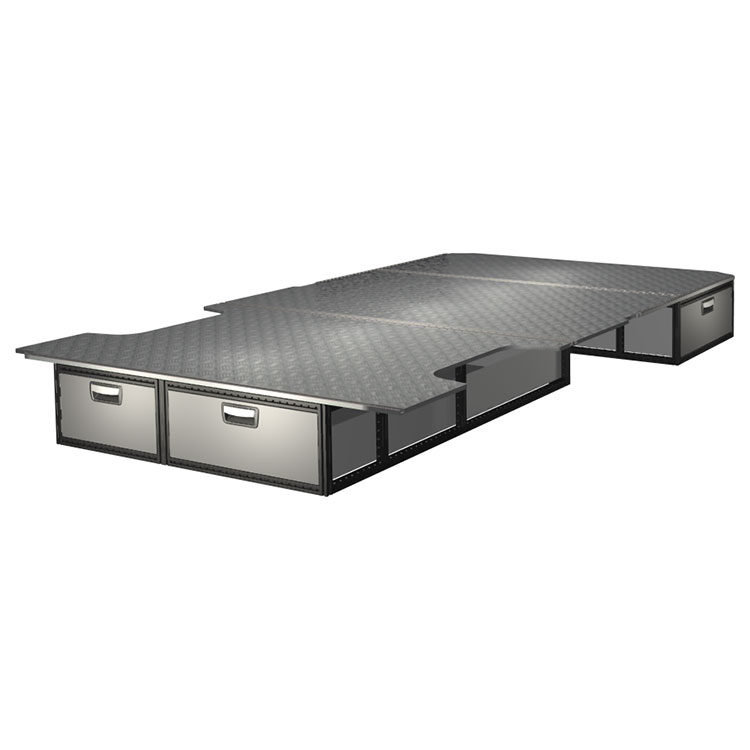 The kit is designed to be fitted on top of a wooden floor. The double floor is equipped with rails for easy installation of vehicle racking, and edging strips for a nice finish.