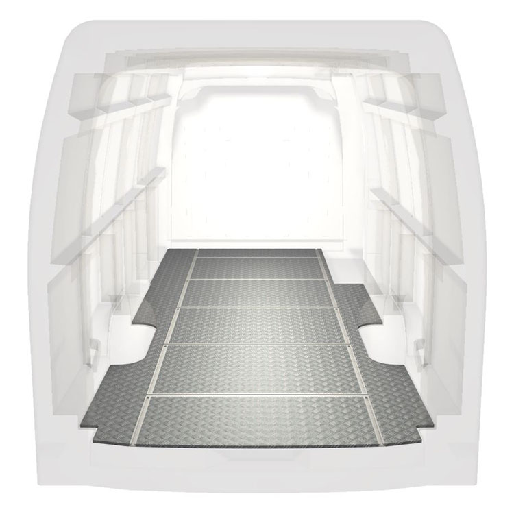 Lehká a robustní podlaha s příčnými kolejnicemi pro dodávky Renault Master / Opel Movano / Nissan NV400 s protiskluzovou hliníkovou deskou a nákladními kolejnicemi (podélnými a příčnými) pro rychlou a bezpečnou montáž regálových systémů a dalšího příslušenství.