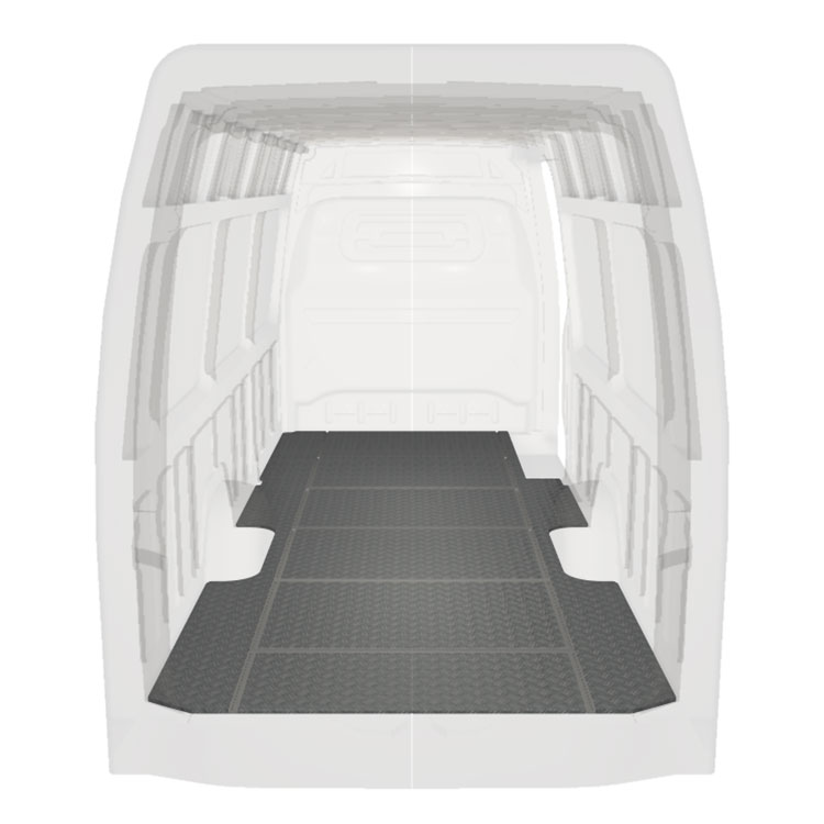 Lehká a robustní podlaha s příčnými kolejnicemi pro dodávky Mercedes Sprinter s protiskluzovou hliníkovou deskou a nákladními kolejnicemi (podélnými a příčnými) pro rychlou a bezpečnou montáž regálových systémů a dalšího příslušenství.