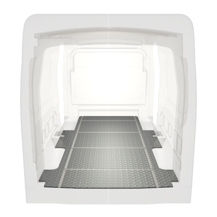Lehká a robustní podlaha s příčnými kolejnicemi pro dodávky Ford Transit s protiskluzovou hliníkovou deskou a nákladními kolejnicemi (podélnými a příčnými) pro rychlou a bezpečnou montáž regálových systémů a dalšího příslušenství.