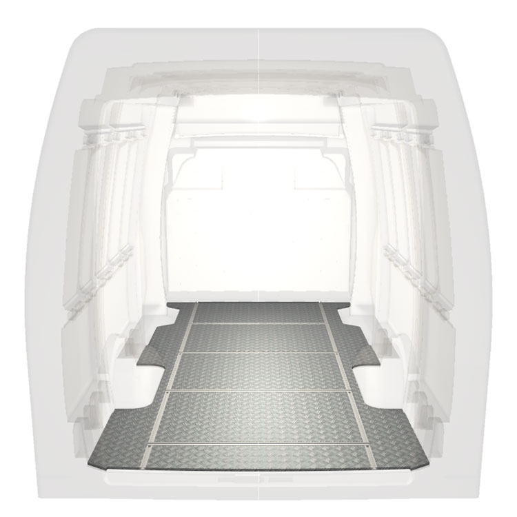 Lehká a robustní podlaha s příčnými kolejnicemi pro dodávky Iveco Daily s protiskluzovou hliníkovou deskou a nákladními kolejnicemi (podélnými a příčnými) pro rychlou a bezpečnou montáž regálových systémů a dalšího příslušenství.