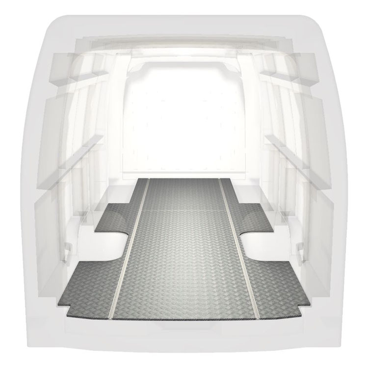 Lehká a robustní extra dlouhá podlaha pro dodávky Renault Master / Opel Movano / Nissan NV400 s protiskluzovou hliníkovou deskou a nákladními kolejnicemi (podélnými) pro rychlou a bezpečnou montáž regálových systémů a dalšího příslušenství.