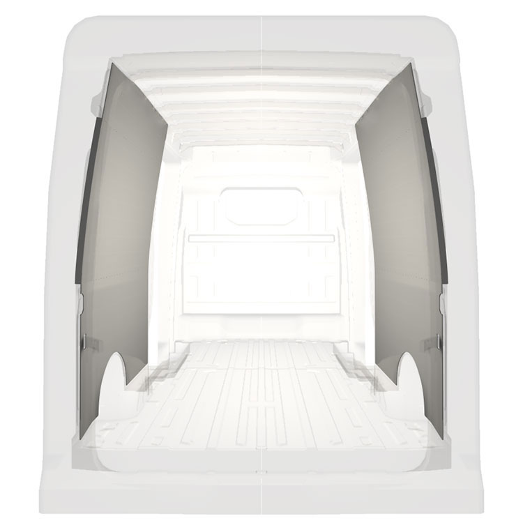 Lehké kompletní obložení vnitřních stěn dodávek Volkswagen Crafter / MAN TGE s dvojitými bočními dveřmi. Panelové obložení vytváří světlé a příjemné pracovní prostředí a snadno se čistí.