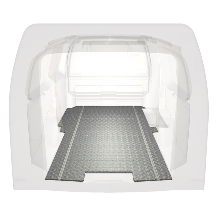 Lehká a robustní standardní podlaha do dodávky Citroën Jumpy / Peugeot Expert / Toyota ProAce s protiskluzovou hliníkovou deskou a nákladními kolejnicemi (podélnými) pro rychlou a bezpečnou montáž regálových systémů a dalšího příslušenství.