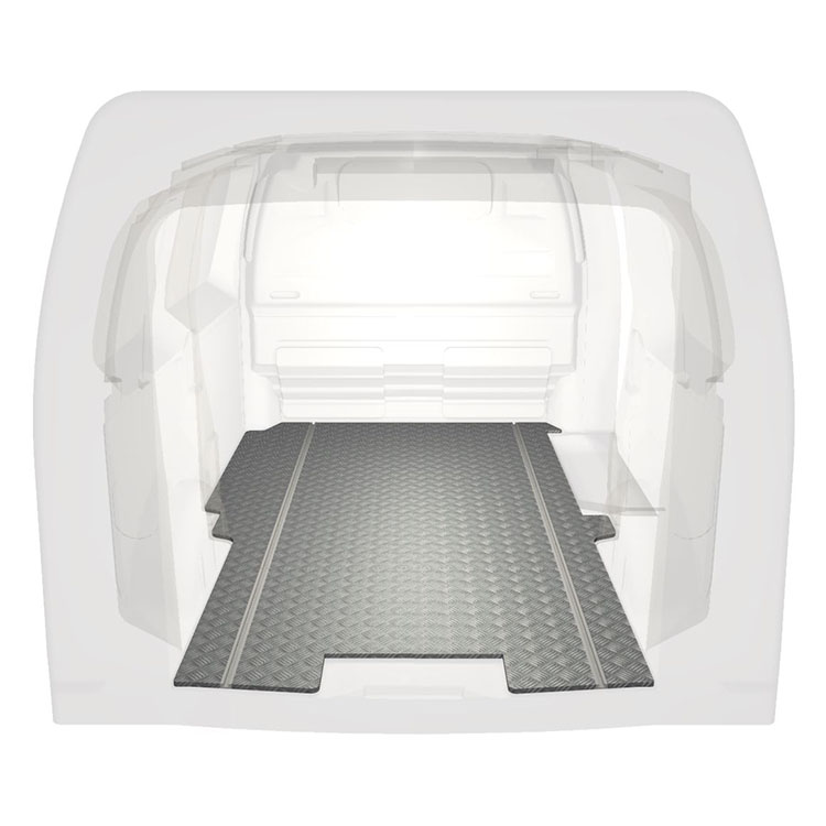 Lightweight and robust extra long floor for Citroën Jumpy / Peugeot Expert / Toyota ProAce with anti-slip aluminum tread plate and cargo rails (longitudinal) for quick and safe installation of racking systems and other accessories.