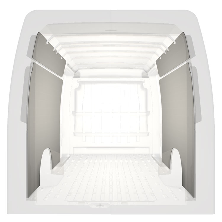 Lehké kompletní obložení vnitřních stěn dodávek Citroën Jumper / Peugeot Boxer / Fiat Ducato s dvojitými bočními dveřmi. Panelové obložení vytváří světlé a příjemné pracovní prostředí a snadno se čistí.