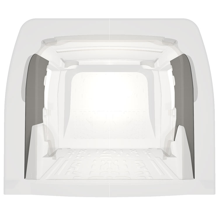 Lehké kompletní obložení vnitřních stěn dodávek Opel Combo / Fiat Doblò s dvojitými bočními dveřmi. Panelové obložení vytváří světlé a příjemné pracovní prostředí a snadno se čistí.