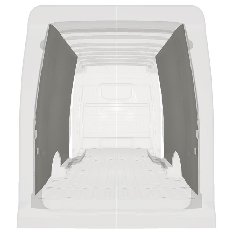 Lehké kompletní obložení vnitřních stěn dodávek Volkswagen Crafter / MAN TGE s dvojitými bočními dveřmi. Panelové obložení vytváří světlé a příjemné pracovní prostředí a snadno se čistí.