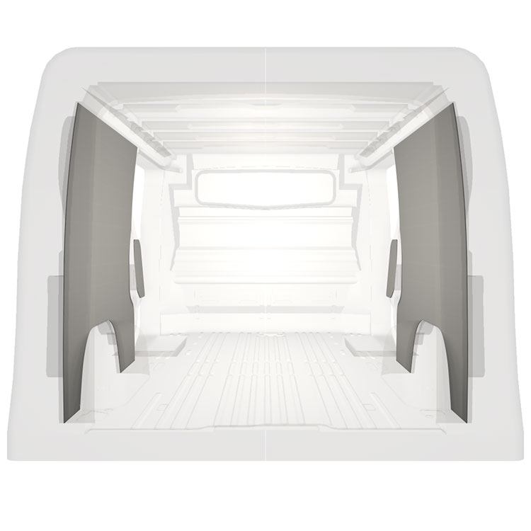 Lehké kompletní obložení vnitřních stěn dodávek Renault Trafic / Opel Vivaro / Fiat Talento / Nissan NV300 s dvojitými bočními dveřmi. Panelové obložení vytváří světlé a příjemné pracovní prostředí a snadno se čistí.