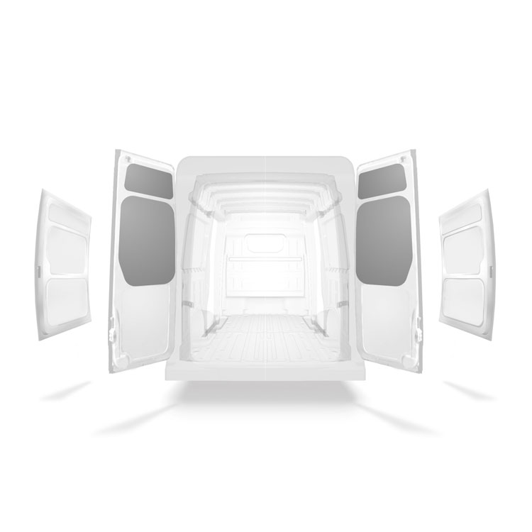 Lehké panelové obložení horní části zadních dveří dodávek Volkswagen Crafter / MAN TGE s dvoukřídlými dveřmi. Obložení dveří vytváří profesionální vzhled uvnitř vozidla, chrání jej a snadno se čistí.