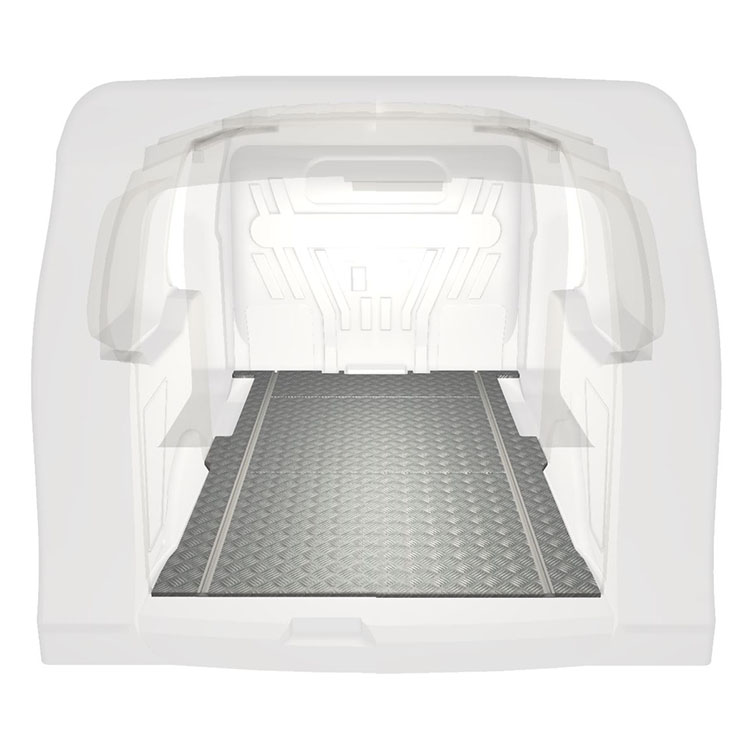 Lehká a robustní standardní podlaha do dodávky Ford Transit Connect s protiskluzovou hliníkovou deskou a nákladními kolejnicemi (podélnými) pro rychlou a bezpečnou montáž regálových systémů a dalšího příslušenství.