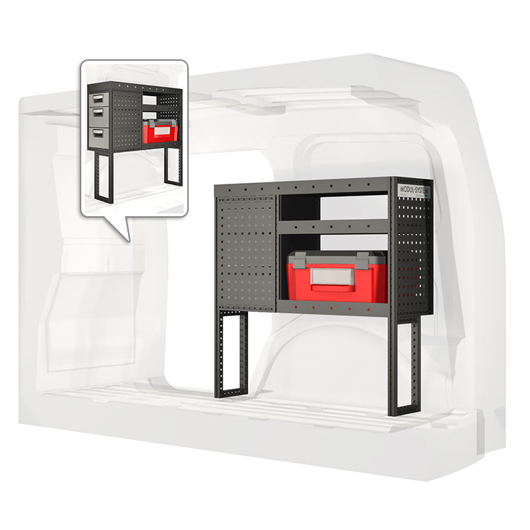 The racking has been specially designed to ensure the optimum fit to the vehicle, as well as the best possible functionality and safety. It has been developed for professional use, is flexible and is intended for service jobs in various types of business. All shelves are equipped with rubber mats, and all drawers with foam plastic liners. Assembly material is included.
