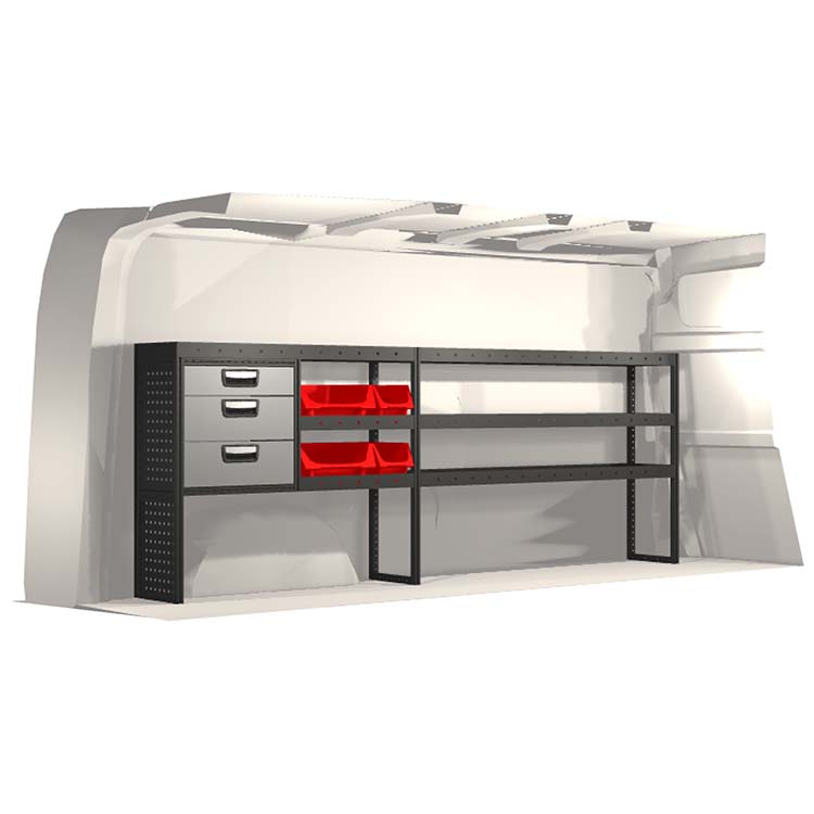 The racking has been specially designed to ensure the optimum fit to the vehicle, as well as the best possible functionality and safety. It has been developed for professional use, is flexible and is intended for service jobs in various types of business. All shelves are equipped with rubber mats, and all drawers with foam plastic liners. Assembly material is included.