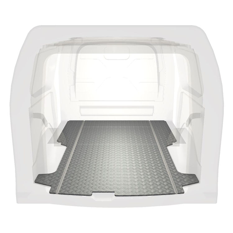 Lehká a robustní standardní podlaha do dodávky Ford Transit Custom s protiskluzovou hliníkovou deskou a nákladními kolejnicemi (podélnými) pro rychlou a bezpečnou montáž regálových systémů a dalšího příslušenství.