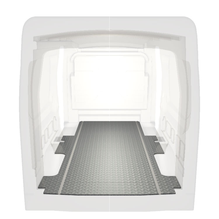 Lehká a robustní extra dlouhá podlaha pro dodávky Ford Transit s protiskluzovou hliníkovou deskou a nákladními kolejnicemi (podélnými) pro rychlou a bezpečnou montáž regálových systémů a dalšího příslušenství.