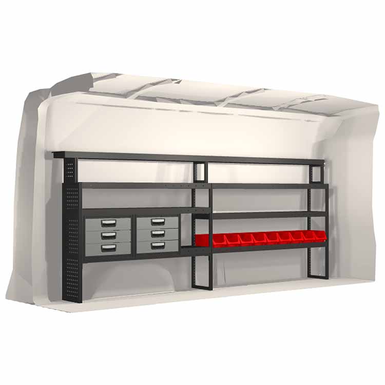 The racking has been specially designed to ensure the optimum fit to the vehicle, as well as the best possible functionality and safety. It has been developed for professional use, is flexible and is intended for service jobs in various types of business. All shelves are equipped with rubber mats, and all drawers with foam plastic liners. Assembly material is included.