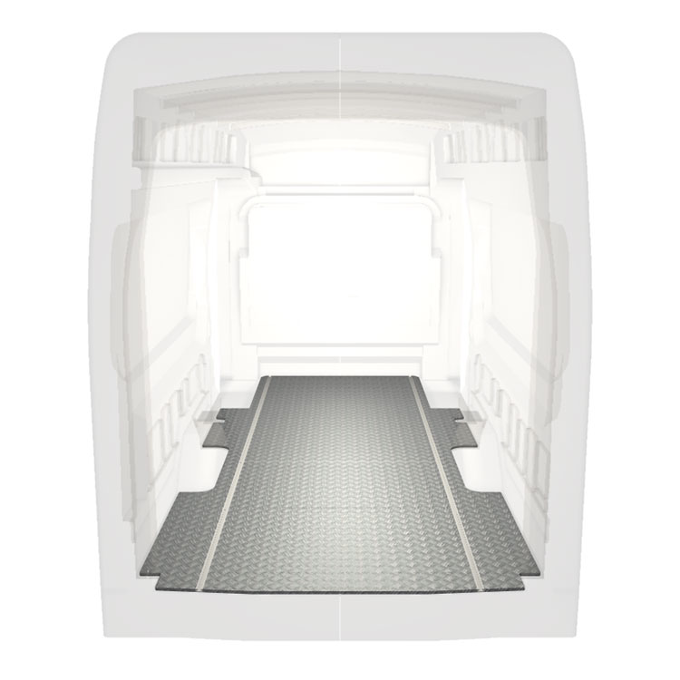 Lehká a robustní standardní podlaha do dodávky Ford Transit s protiskluzovou hliníkovou deskou a nákladními kolejnicemi (podélnými) pro rychlou a bezpečnou montáž regálových systémů a dalšího příslušenství.