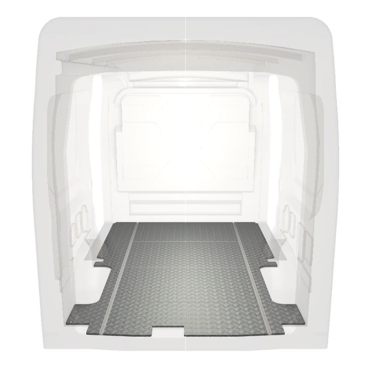 Lehká a robustní standardní podlaha do dodávky Ford Transit s protiskluzovou hliníkovou deskou a nákladními kolejnicemi (podélnými) pro rychlou a bezpečnou montáž regálových systémů a dalšího příslušenství.