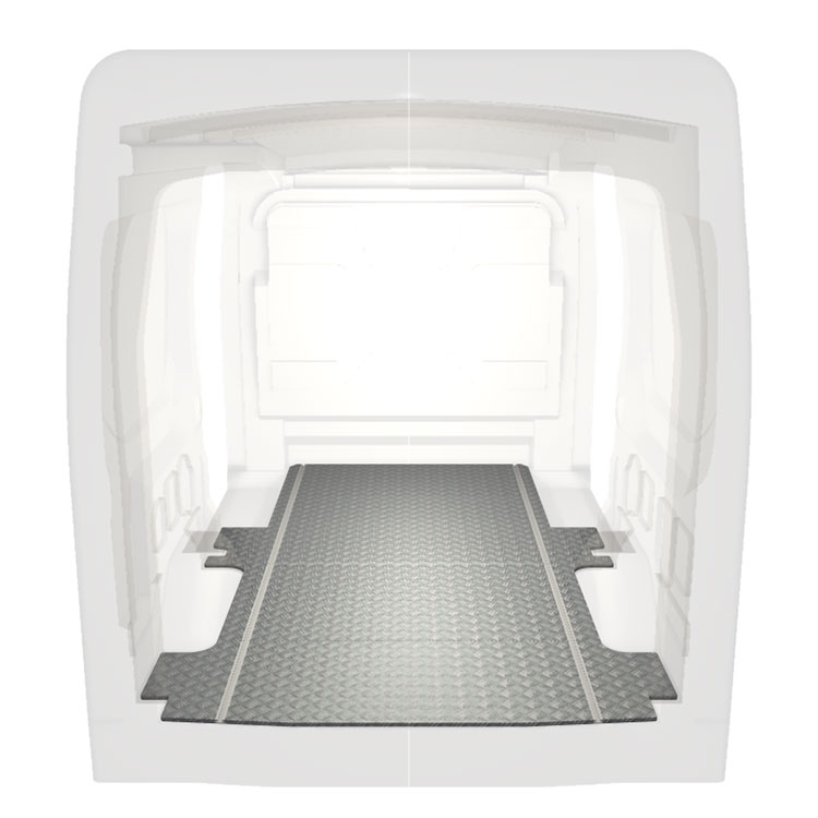 Lehká a robustní standardní podlaha do dodávky Ford Transit s protiskluzovou hliníkovou deskou a nákladními kolejnicemi (podélnými) pro rychlou a bezpečnou montáž regálových systémů a dalšího příslušenství.