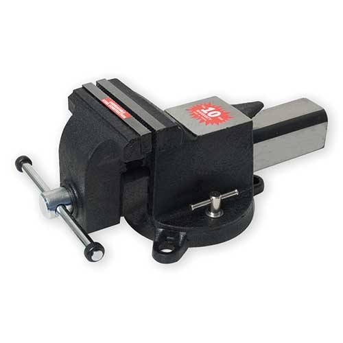 Cast steel vice with a jaw width of 125 mm. The vice has an integrated swivel base and built-in jaws for pipes.