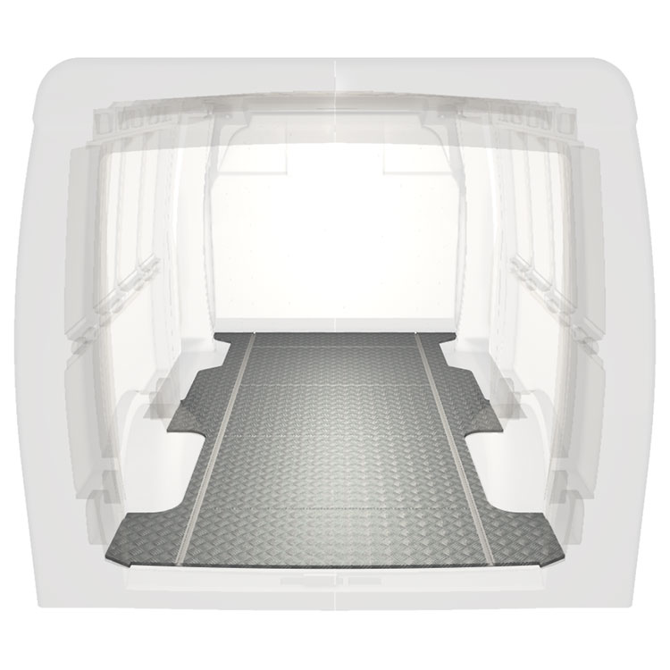 Lehká a robustní standardní podlaha do dodávky Iveco Daily s protiskluzovou hliníkovou deskou a nákladními kolejnicemi (podélnými) pro rychlou a bezpečnou montáž regálových systémů a dalšího příslušenství.