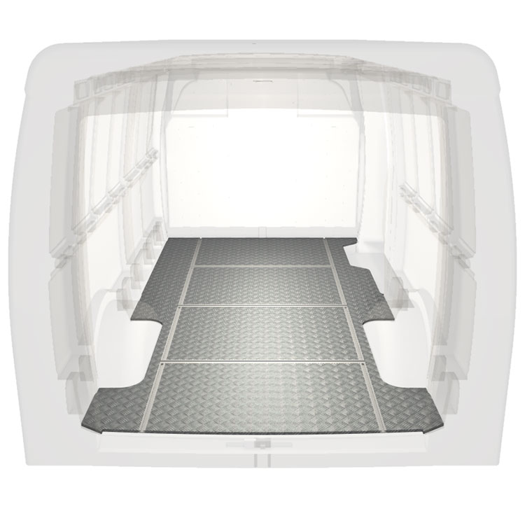 Lehká a robustní podlaha s příčnými kolejnicemi pro dodávky Iveco Daily s protiskluzovou hliníkovou deskou a nákladními kolejnicemi (podélnými a příčnými) pro rychlou a bezpečnou montáž regálových systémů a dalšího příslušenství.