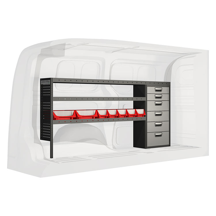 The racking has been specially designed to ensure the optimum fit to the vehicle, as well as the best possible functionality and safety. It has been developed for professional use, is flexible and is intended for service jobs in various types of business. All shelves are equipped with rubber mats, and all drawers with foam plastic liners.