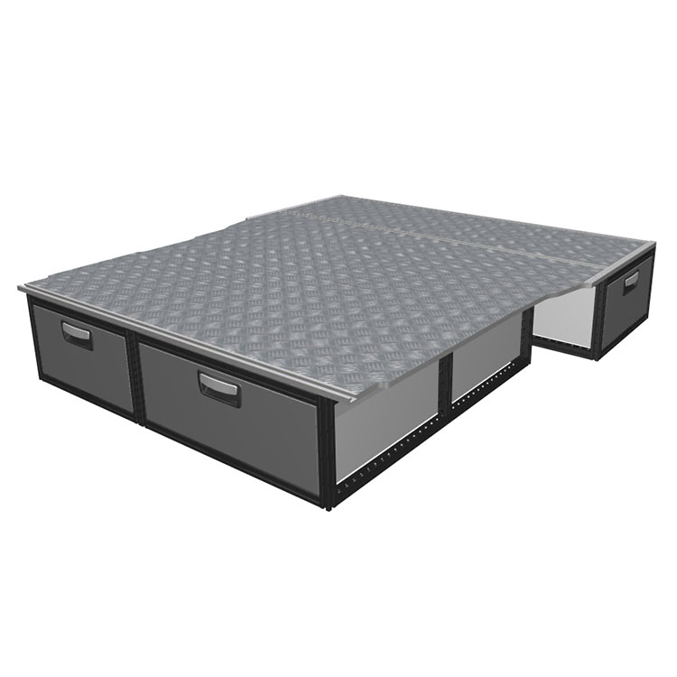 The kit is designed to be fitted on top of a Modul-Floor, utilizing the floor rails for a non-intrusive installation. The double floor is equipped with rails for easy installation of vehicle racking, and edging strips for a nice finish.