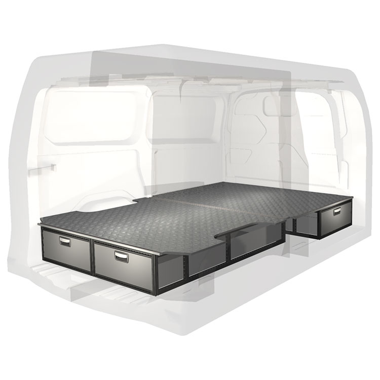The kit is designed to be fitted on top of a wooden floor. The double floor is equipped with rails for easy installation of vehicle racking, and edging strips for a nice finish.