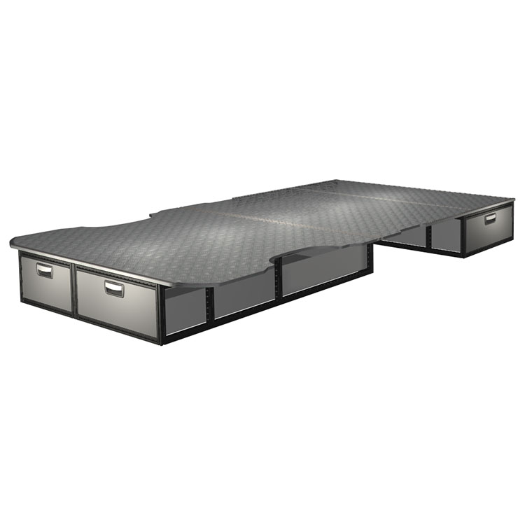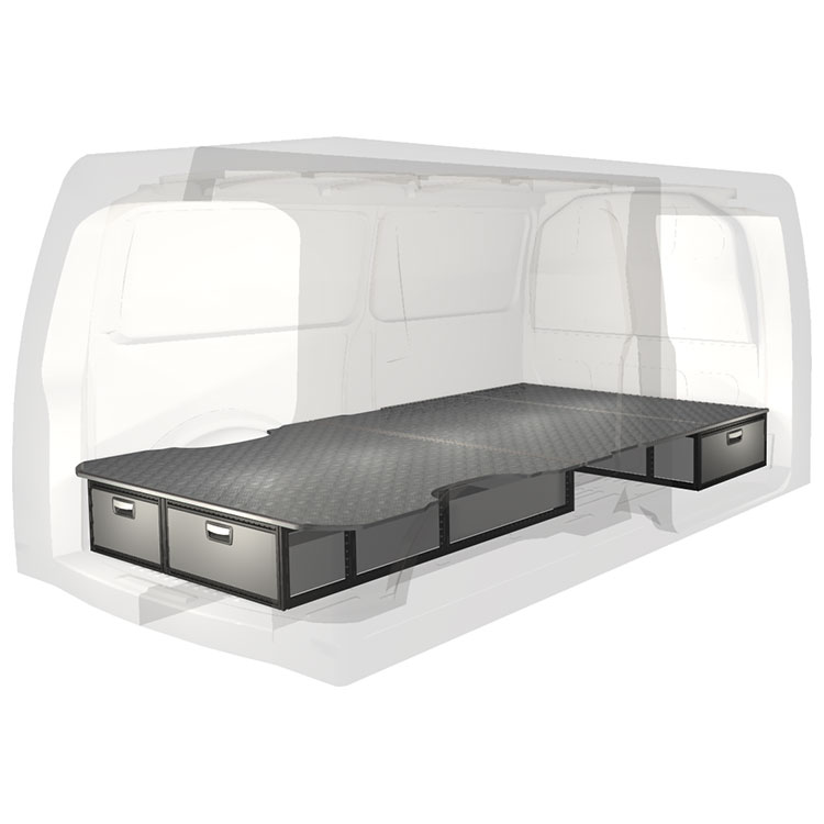 The kit is designed to be fitted on top of a wooden floor. The double floor is equipped with rails for easy installation of vehicle racking, and edging strips for a nice finish.