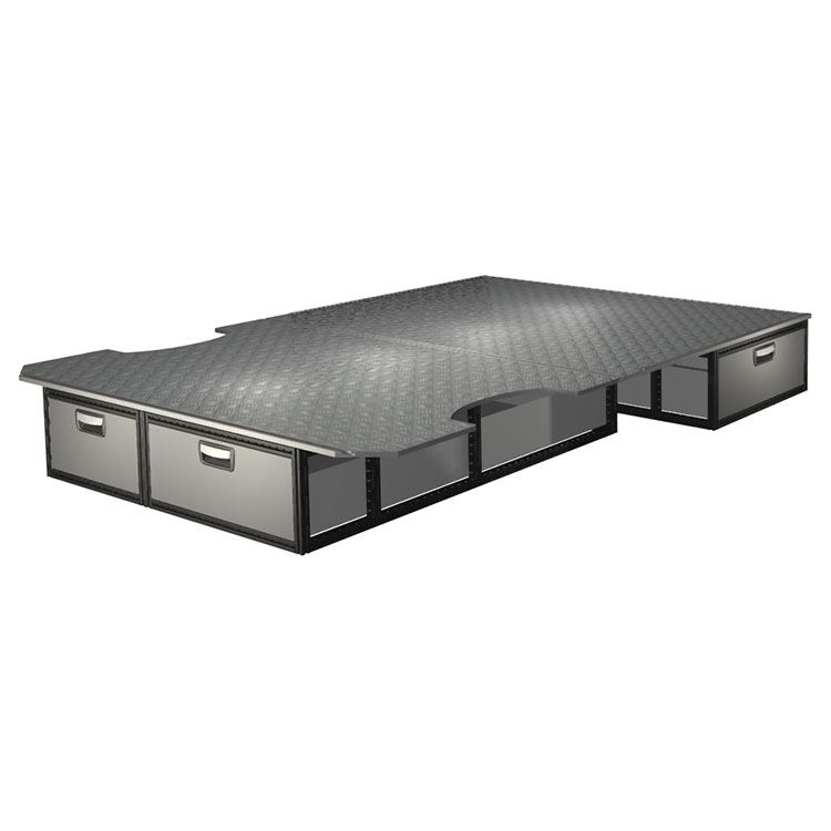 The kit is designed to be fitted on top of a Modul-Floor, utilizing the floor rails for a non-intrusive installation. The double floor is equipped with rails for easy installation of vehicle racking, and edging strips for a nice finish.