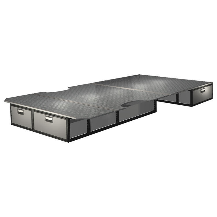 The kit is designed to be fitted on top of a wooden floor. The double floor is equipped with rails for easy installation of vehicle racking, and edging strips for a nice finish.