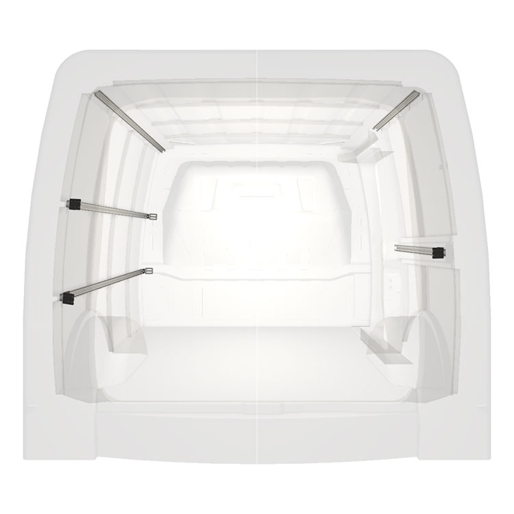 Complete set of Modul-Rails for the vehicle's inner walls. Fixing vehicle racking and other accessories to rails instead of the vehicle body facilitates the installation.