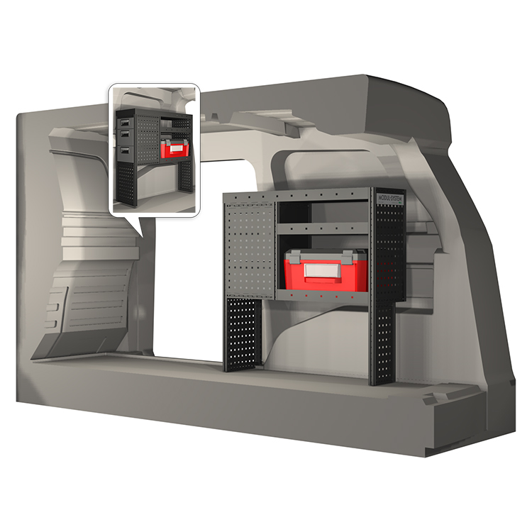 The racking has been specially designed to ensure the optimum fit to the vehicle, as well as the best possible functionality and safety. It has been developed for professional use, is flexible and is intended for service jobs in various types of business. All shelves are equipped with rubber mats, and all drawers with foam plastic liners. Assembly material is included.