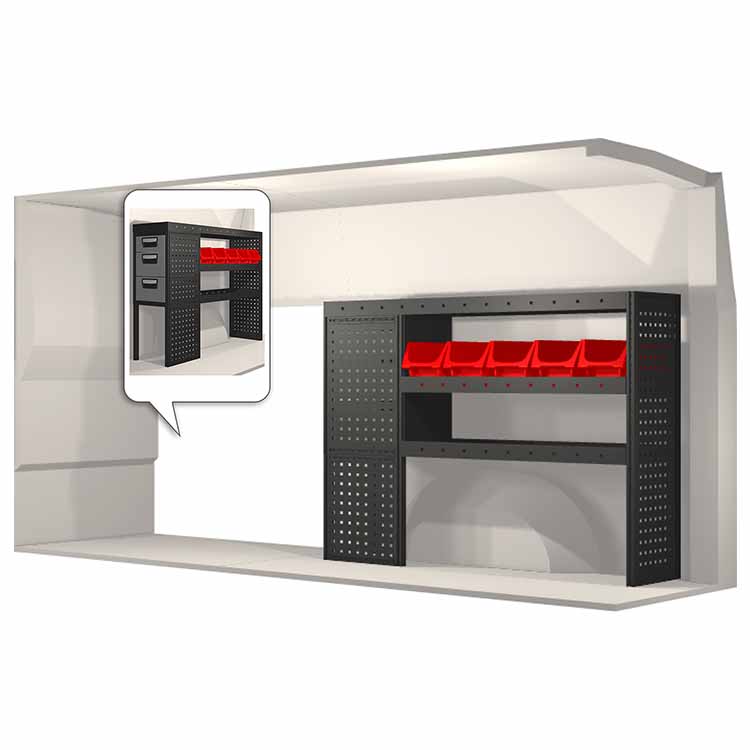 The racking has been specially designed to ensure the optimum fit to the vehicle, as well as the best possible functionality and safety. It has been developed for professional use, is flexible and is intended for service jobs in various types of business. All shelves are equipped with rubber mats, and all drawers with foam plastic liners. Assembly material is included.