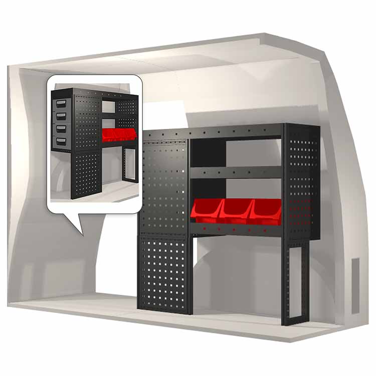 The racking has been specially designed to ensure the optimum fit to the vehicle, as well as the best possible functionality and safety. It has been developed for professional use, is flexible and is intended for service jobs in various types of business. All shelves are equipped with rubber mats, and all drawers with foam plastic liners. Assembly material is included.