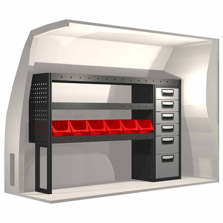 The racking has been specially designed to ensure the optimum fit to the vehicle, as well as the best possible functionality and safety. It has been developed for professional use, is flexible and is intended for service jobs in various types of business. All shelves are equipped with rubber mats, and all drawers with foam plastic liners. Assembly material is included.