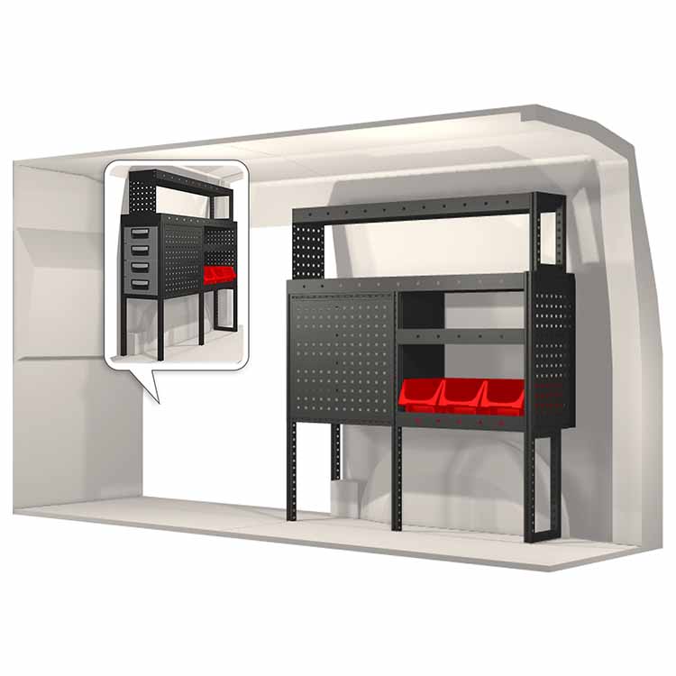 The racking has been specially designed to ensure the optimum fit to the vehicle, as well as the best possible functionality and safety. It has been developed for professional use, is flexible and is intended for service jobs in various types of business. All shelves are equipped with rubber mats, and all drawers with foam plastic liners. Assembly material is included.