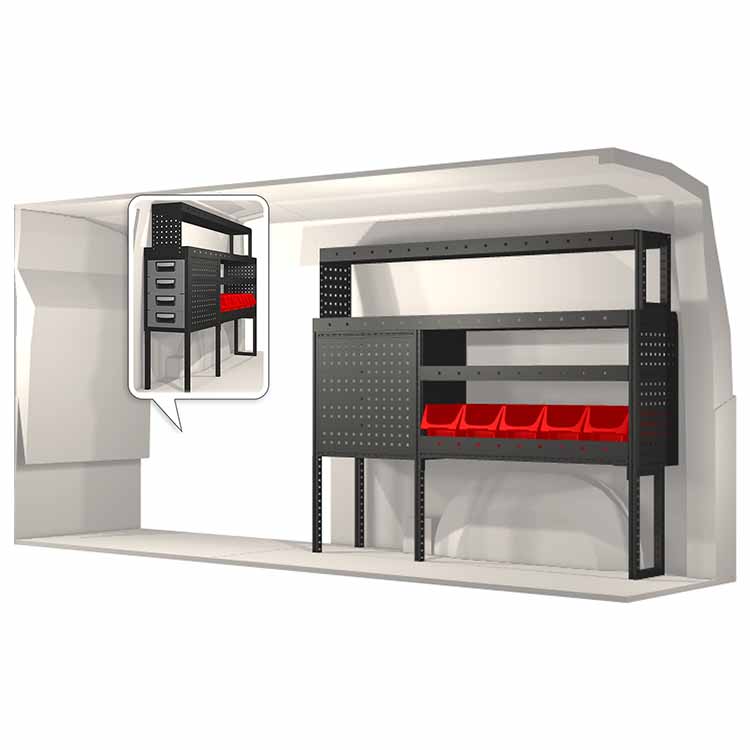 The racking has been specially designed to ensure the optimum fit to the vehicle, as well as the best possible functionality and safety. It has been developed for professional use, is flexible and is intended for service jobs in various types of business. All shelves are equipped with rubber mats, and all drawers with foam plastic liners. Assembly material is included.